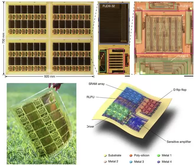 这款新研发的柔性AI芯片采用了CMOS低温多晶硅(LTPS)工艺,可直接在柔性基底上制造,兼具低功耗、低成本和高度集成的优势。研究团队通过工艺革新增加金属层数,突破了传统柔性电子难以支持复杂芯片互连的瓶颈;其创新性地采用了数字“存内计算”架构,直接在存储器内部完成数据处理。这种设计既消除了数据搬运带来的时间与能耗开销,又突破了“存储墙”的性能限制,表现优于传统模拟方案。