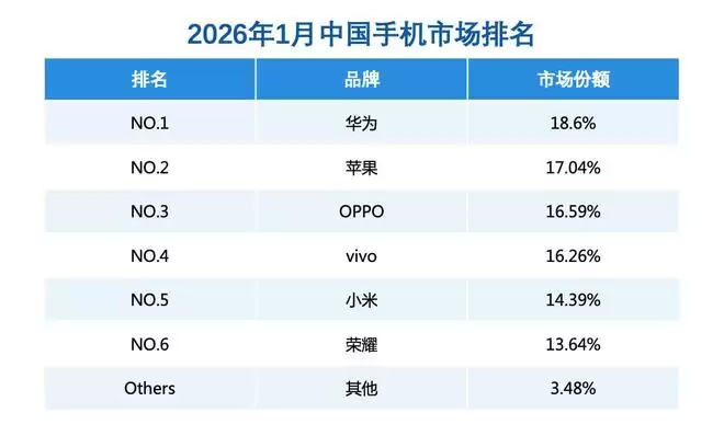 2026年1月中国手机市场排名:华为以18.6%市占率位居榜首