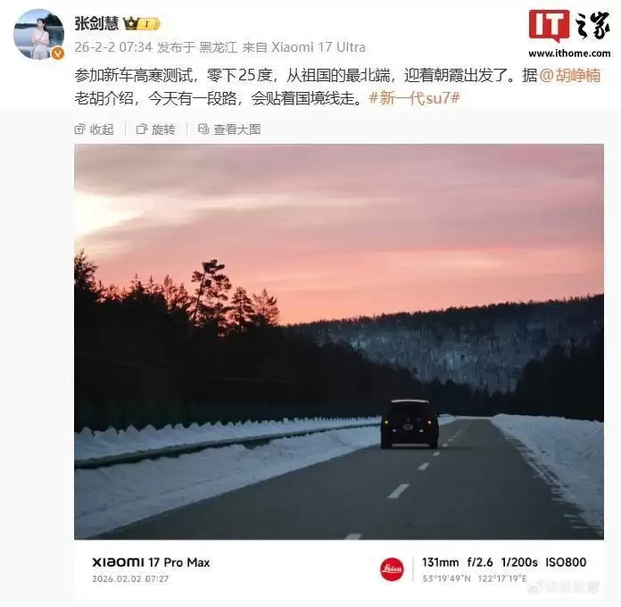与此同时,小米集团副总裁张剑慧也在微博上透露了新车测试的更多细节。她表示自己正亲身参与新车的高寒环境测试,并提到其中一段测试路线将沿着边境线行驶。张剑慧还分享了一张车辆动态照片,照片中可以清晰看到蓝色示宽灯已经点亮,暗示新车可能已进入实际道路测试阶段。