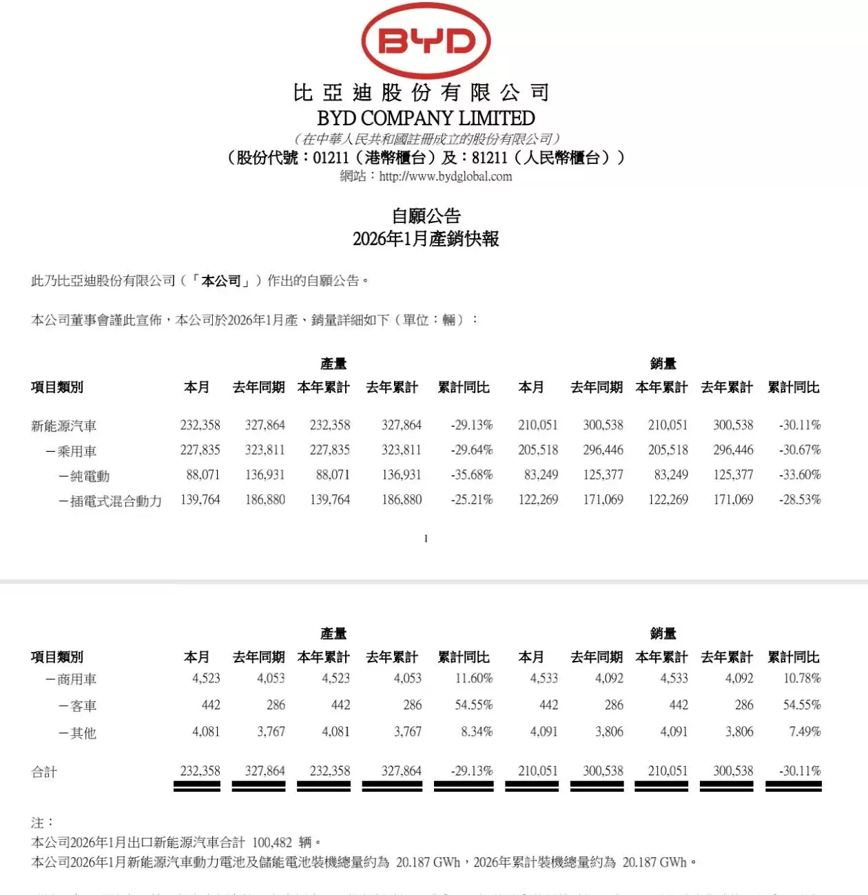 比亚迪股份近日在港交所披露了最新的运营数据,揭示了2026年首月新能源汽车业务出现的显著波动。数据显示,当月公司新能源汽车产量为232,358辆,较去年同期收缩了29.13%;同期销量为210,051辆,同比下降幅度达到30.11%。这一产销双双下滑的局面,迅速引发了市场的密切关注。
