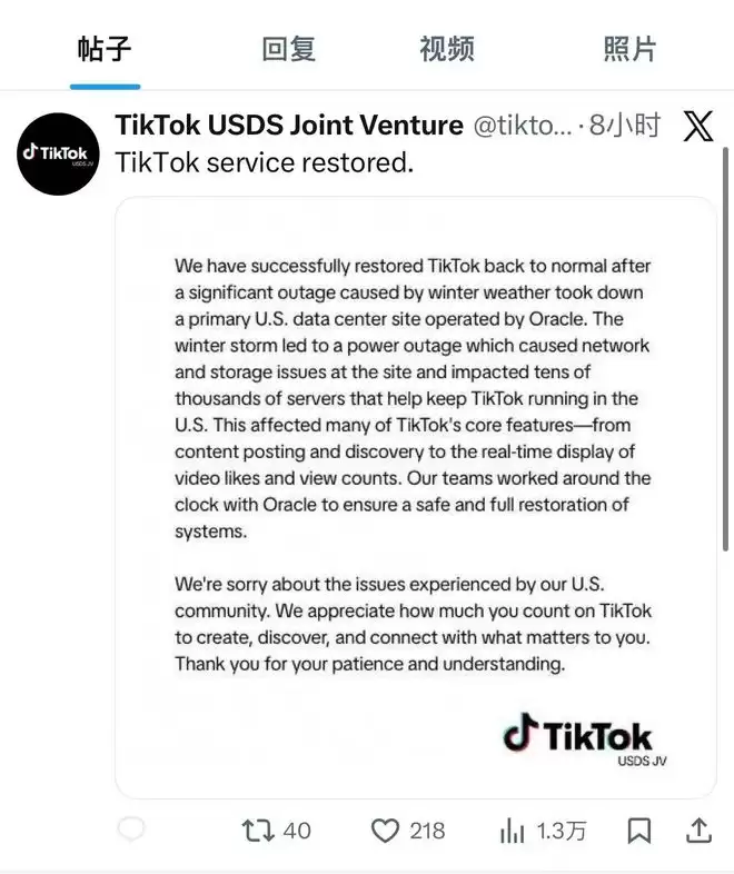 美国当地时间2月1日,TikTok美国数据安全合资有限责任公司(简称TikTok USDS合资公司)在其X平台官方账号发布消息称,在经历上周由冬季恶劣天气引发的重大服务中断后,平台已于周日恢复正常运行。此次中断源于甲骨文公司运营的美国数据中心发生瘫痪。
