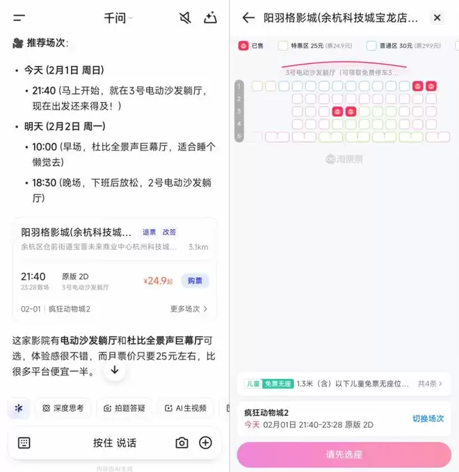 举个栗子,打开千问APP主对话框,查询电影票后,就能直接购买。目前,AI购电影票功能,还在灰度测试中。