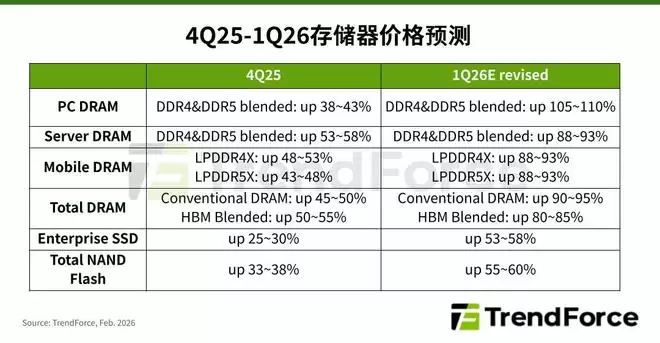 TrendForce在解释PC DRAM价格剧烈变动时表示,这主要由于2025年第四季度整机出货表现优于预期,且整体缺货态势持续,即使头部品牌制造商的库存水位也已出现下滑,上游原厂的议价能力有增无减。