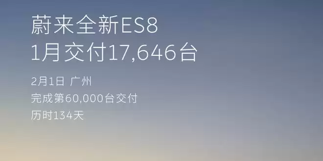 其中,蔚来全新 ES8 是绝对的交付主力。 1 月份,全新 ES8 交付17646 台,占总交付量的65%,同时,单车型用时134天完成60000台交付,成为名副其实的纯电大三排SUV第一。