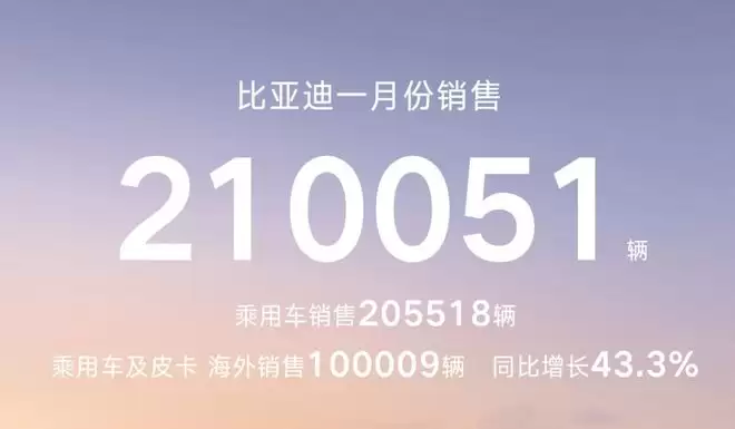 不过值得一提的是,虽然国内市场受到了购置税补贴调整等因素影响,比亚迪在海外市场保持了高位增长,1月比亚迪乘用车及皮卡海外销售100009辆,同比增长43.3%,占比亚迪1月总销量的47.6%。
