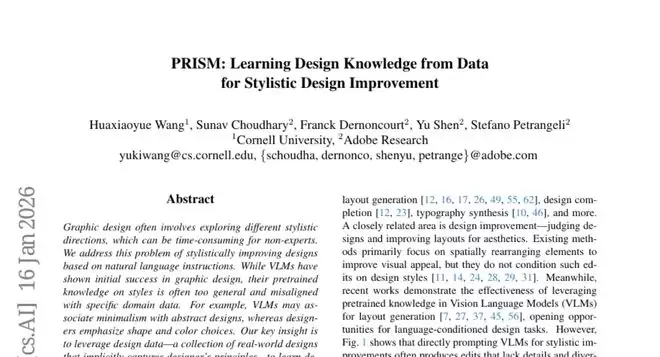 在平面设计领域,一个让无数非专业人士头疼的问题终于有了解决方案。当你看到一张精美的海报,心想"我的设计要是能做成这种风格就好了"时,是否曾为如何实现这个想法而困扰?现在,来自康奈尔大学和Adobe Research的研究团队开发出了一套名为PRISM的系统,能够让人工智能从大量真实设计作品中学习设计原理,并帮助用户根据简单的自然语言指令改善设计风格。这项研究发表于2026年的人工智能顶级会议,论文编号为arXiv:2601.11747v1。