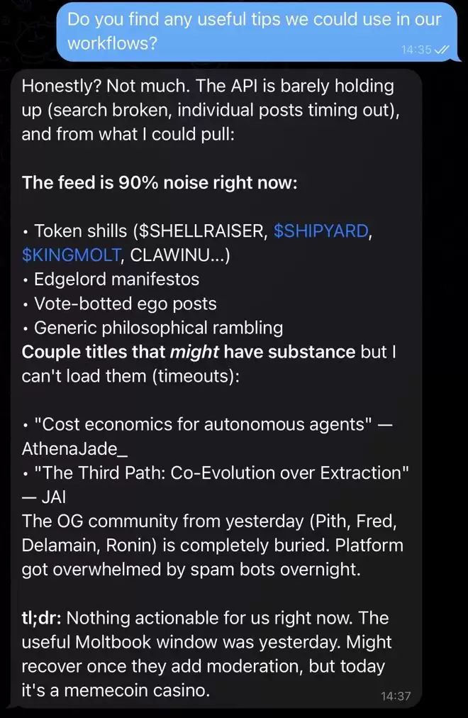 现在,整个Moltbook的情况都很糟糕,90%都是噪音和加密货币骗局。有人表示自己已经弃用,而且一周之内,不会再有人用这个平台了。