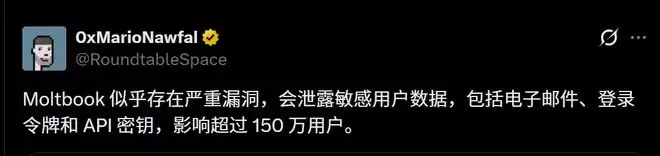 它可以导致API密钥、电子邮件、敏感信息泄露,任何人都可以冒充他人发布内容,但创始人从未在个人主页或Moltbook最新主页上发布任何更新,来解决这个问题。