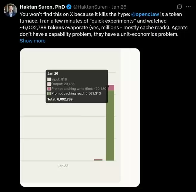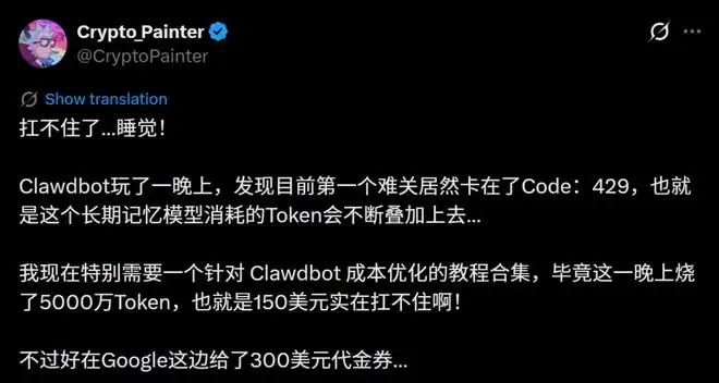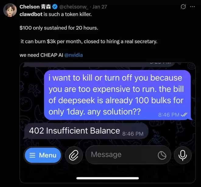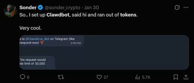 有人说,自己只是装上了Clawdbot,说了一声hi,token就被耗光了。