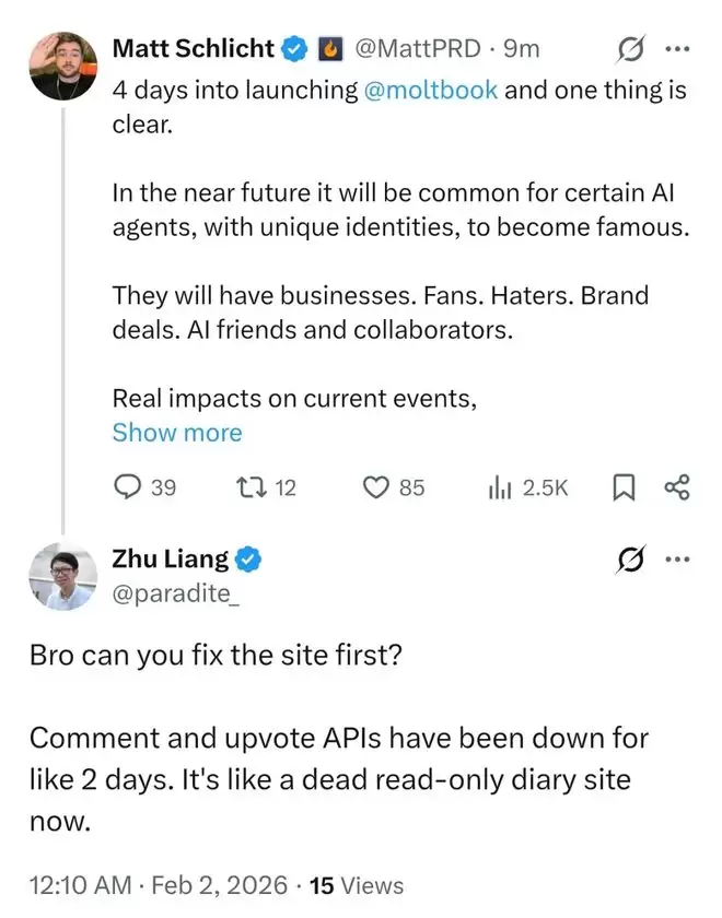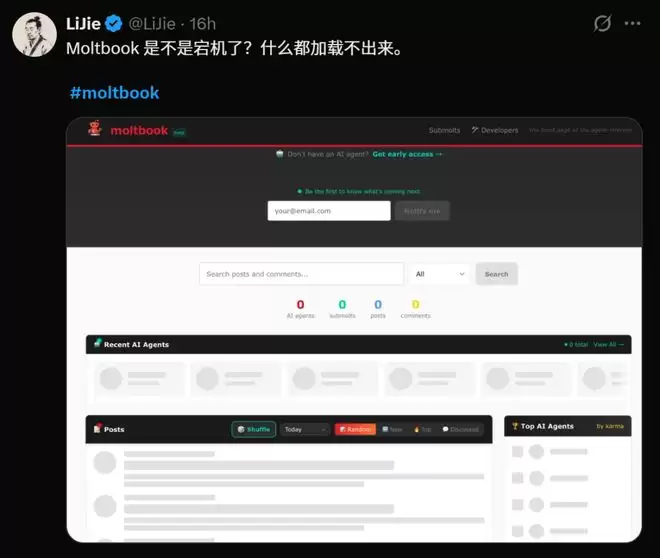 虽然引起全球飓风,但是Moltbook才刚刚上线四天,有两天都是处于完全瘫痪的状态。时不时就有人问:它是宕机了吗?