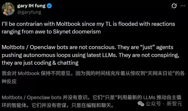 有人说,在这里,Moltbot们只是在用最新LLM跑自主循环的AI智能体,没有AI在密谋,只是在编程和聊天而已。