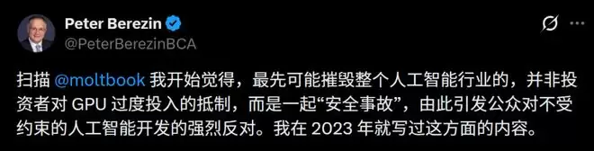 前高盛和国际货币基金组织官员Peter Berezin说,看完Moltbook后自己猜测,最先摧毁整个人工智能行业的,并非投资者对GPU过度投入的抵制,而是一起「安全事故」,由此引发公众对不受约束的AI开发的强烈反对。