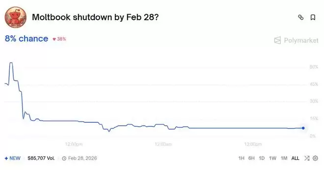 Polymarket预测:Moltbook在2月28日前,有8%的概率倒闭。
