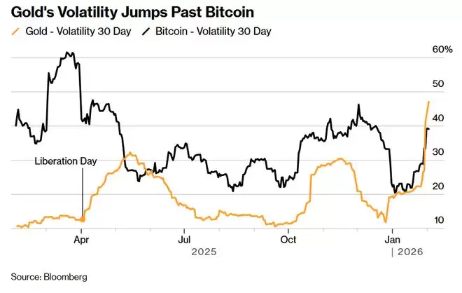 这一反常且极端的现象标志着一种重大逆转,因为黄金通常被视为比加密货币稳健得多的最重要价值储存手段,而加密货币以其极易受到投机势力影响而闻名全球。自比特币17年前重磅问世以来,黄金的波动率指标仅在两次情况下超越比特币,不包括本次超越,最近的一次发生在去年5月,当时由于美国总统唐纳德·特朗普面向全球的关税威胁引发了持续紧张的贸易紧张局势,当时市场“抛售一切可以抛售的资产”——金融市场所有可交易标的价格大幅下跌。