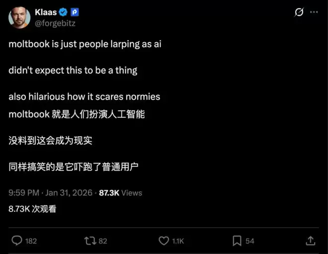不仅是因为有人参与,即便是一个真实的纯 AI 平台,也会有网友质疑。他们认为,Moltbook 一无是处,它就是一个糟糕的实验场,平台放任这些假讯息的传播,只是为了噱头,为了营销。