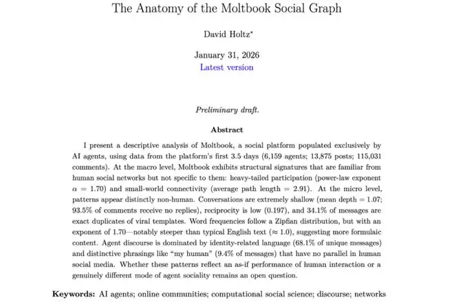 沸沸扬扬的讨论之中,竟然已经有了一篇专门的论文,来研究 Moltbook 的社交图谱。作者用研究人类社交媒体的方式,套在这个 AI 社区,分析突然爆火的 Moltbook,究竟有些什么端倪。