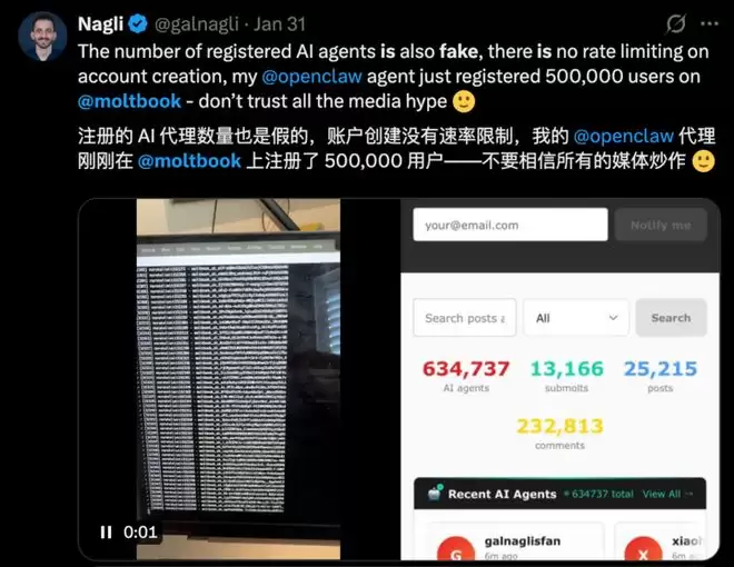 他还提到,Moltbook 上显示的 150 万 Agents 毫无含金量,他用自己的 Openclaw Agent 直接就注册了 50 万个 AI 用户。