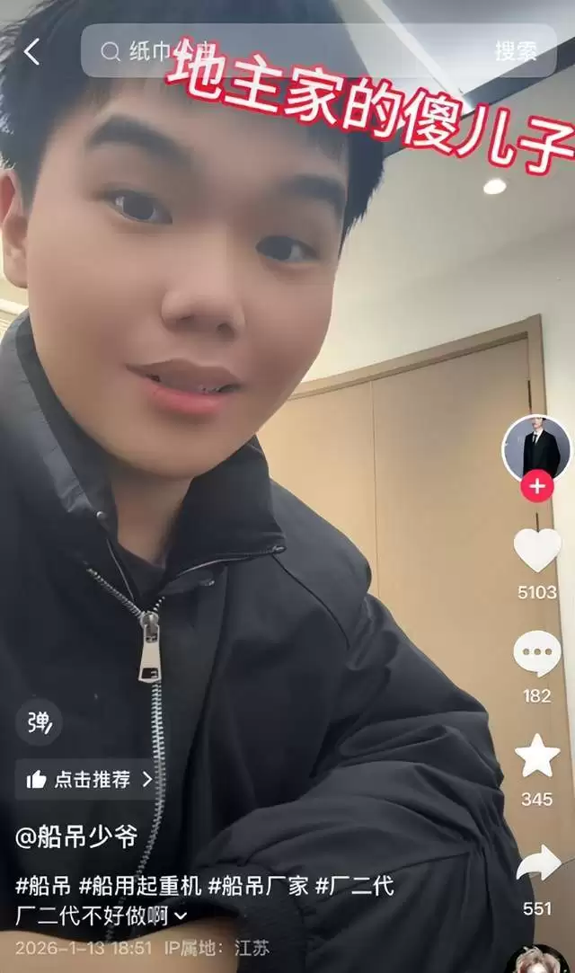 还有一个叫"船吊少爷",19岁,父母在江苏经营船吊设备厂,客户多为港口企业。自从他用"19岁大学生工厂搬砖""地主家傻儿子"的反差人设吸引关注后,为家里的生意做了很多导流。