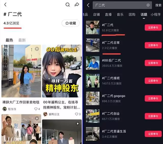 社交媒体更是出现海量"厂二代",他们化身各种"公主""少爷",通过各类方式展示自家产品。仅就"厂二代"这个标签进行搜索,小红书上有4.3亿浏览,抖音上则直接飙升到53亿。