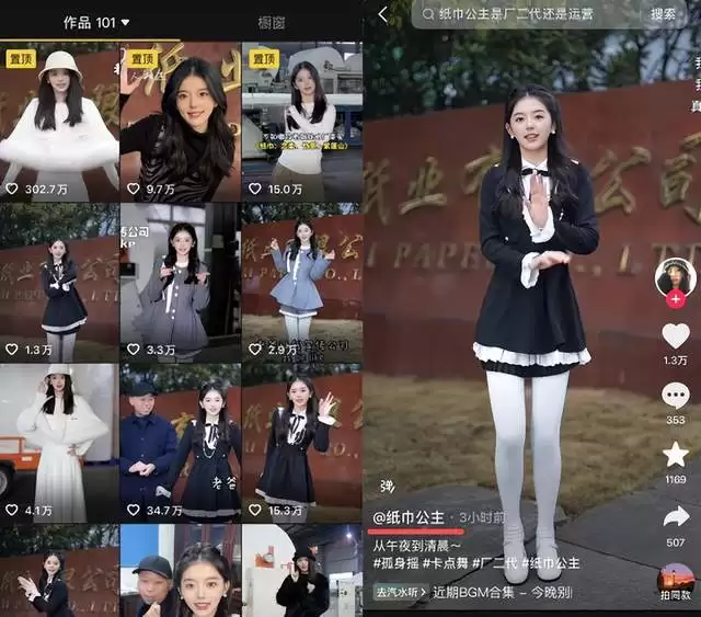 最近比较出名的算是"纸巾公主"。她公开宣称自己是安徽某纸业老板的"真女儿",通过翻跳歌曲、展示工厂实力等内容火速出圈,近一个月涨粉30万,账号橱窗售出上万件产品,销售额超30万。
