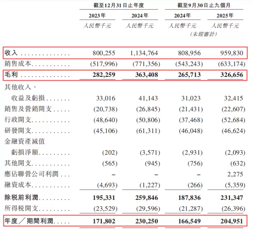 在过去三年,具体为2023年、2024年及2025年1-9月(报告期内),公司的收入分别为8亿元、11.35亿元及9.6亿元,净利润分别为1.72亿元、2.3亿元及2.05亿元,毛利率则分别为35.27%、32.02%及34.03%。