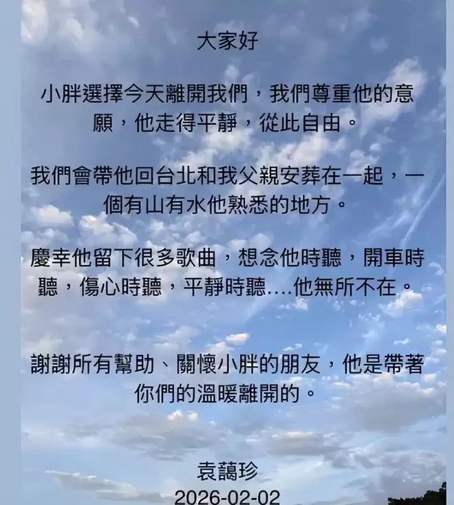 另外,袁惟仁前妻陆元琪也透过经纪人回应了,让大家给予家属和孩子空间,后续相关事宜小胖老师家人会处理,感谢大家体谅和关心。