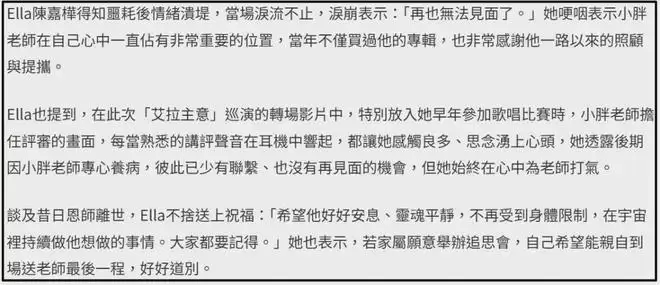 Ella知道袁惟仁去世后情绪崩溃落泪,哽咽表示无法再见面了,称小胖老师对她很重要,一路以来受到很多照顾和鼓励,希望小胖老师好好安息,灵魂不再受到身体限制,如果家属愿意举办追思会,自己会去送最后一程,好好告别。