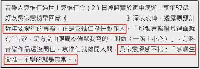 吴宗宪也对袁惟仁的离开表示不舍,他称自己原本筹备的专辑就由袁惟仁担当制作人,但没想到歌曲没发人离世了,人生无常。对于小胖老师的离开,他认为也是一种解脱,从此脱离病痛。