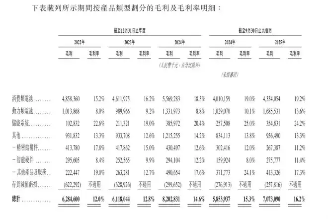 从2024年到2024年,欣旺达的毛利率分别为12%、12.8%以及14.6%。2025年前9个月的毛利率为16.2%,较2024年同期的15.3%提升了0.9个百分点,欣旺达表示原因是产品结构的优化以及规模效应带来的成本降低。