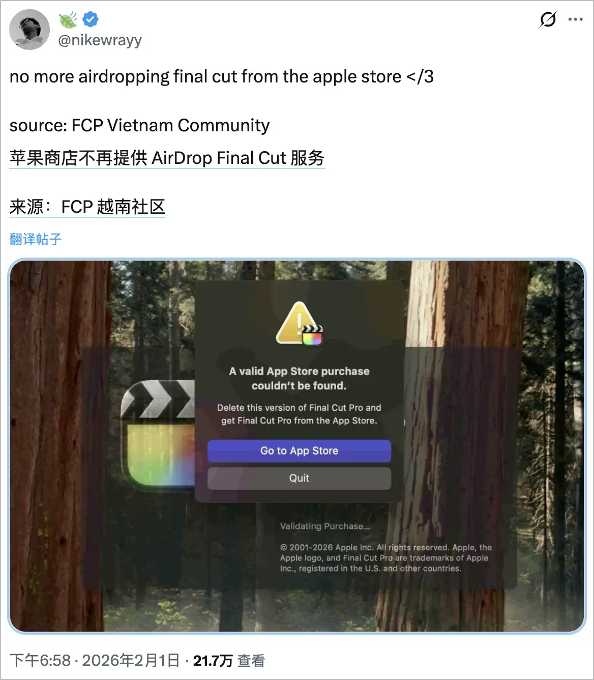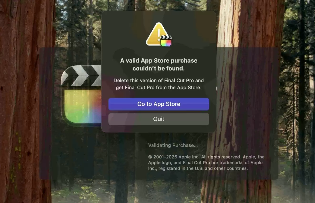 据外媒 SmartPix 透露,苹果近期堵塞了一种长期存在的“曲线安装”方式:以往用户能够借助 AirDrop 功能,将 Final Cut Pro 从另一台 Mac 设备(甚至包括苹果官方商店的展示机)直接传输到自己的电脑上使用,而现在这条路已经走不通了。