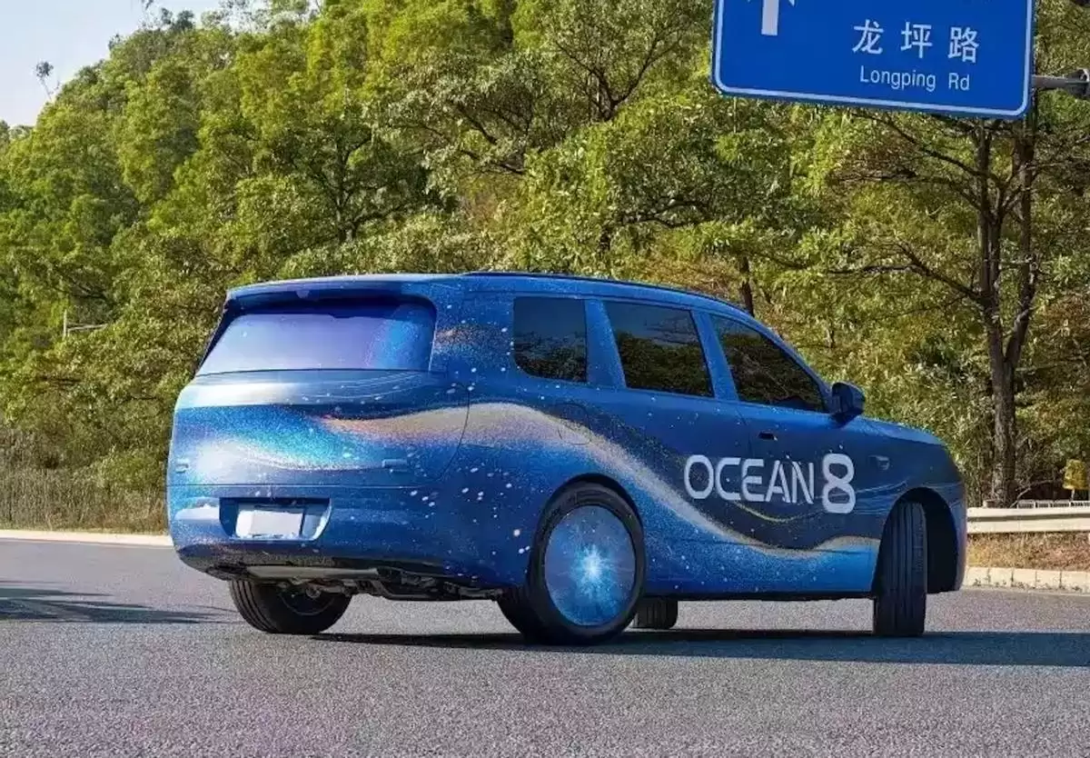 从设计语言来看,海狮08展现出硬朗大气的风格特征。其车身线条平直舒展,前脸采用分体式大灯组设计,车顶配备了激光雷达装置。车尾部分设计简洁,预计采用贯穿式尾灯布局,顶部延伸出扰流板造型。测试谍照显示,该车在转弯时后轮呈现明显转向角度,印证了其搭载后轮转向技术的猜测。