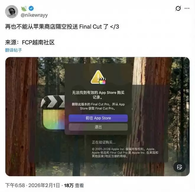 据 X 用户 @nikewrayy 消息,苹果或正在进一步收紧专业软件的授权验证机制,通过 AirDrop(隔空投送)发送的 Final Cut Pro 已经不再可用。