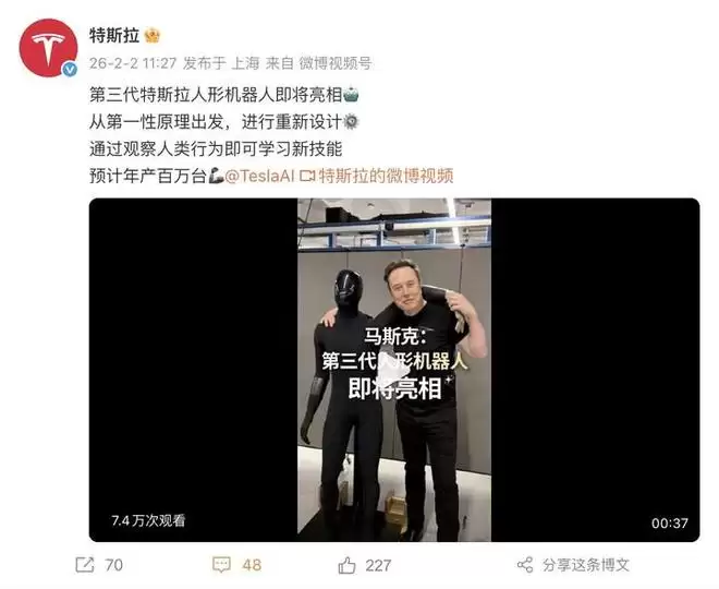据介绍,新一代机器人能够通过演示、口头描述甚至视频示例完成任务,马斯克称其表现将「令所有人大吃一惊」。