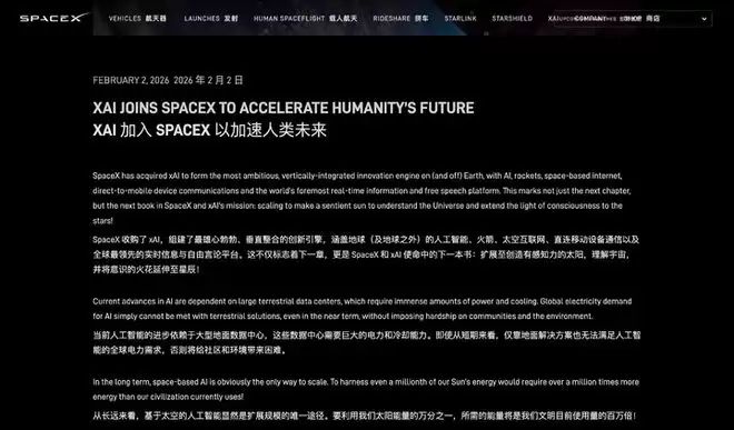 SpaceX 宣布收购 xAI,组建 1.25 万亿美元太空与 AI 巨头