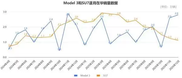 市场格局正在发生深刻变化。乘联会数据显示,小米SU7在2025年以258,164辆的年度交付量超越了特斯拉Model 3,成为中国豪华电动汽车轿车市场的销量冠军。相比之下,特斯拉Model 3同期交付量为200,361辆,虽然同比增长了13%,但其增长速度明显落后于小米。这是小米SU7首次在全年销量上实现对Model 3的超越,领先幅度达到29%。