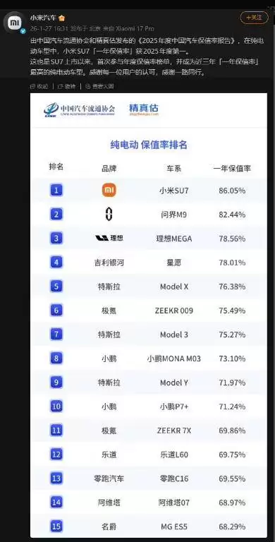 雷军直播揭秘:SU7保值率达86.05%,行业领跑纯电市场