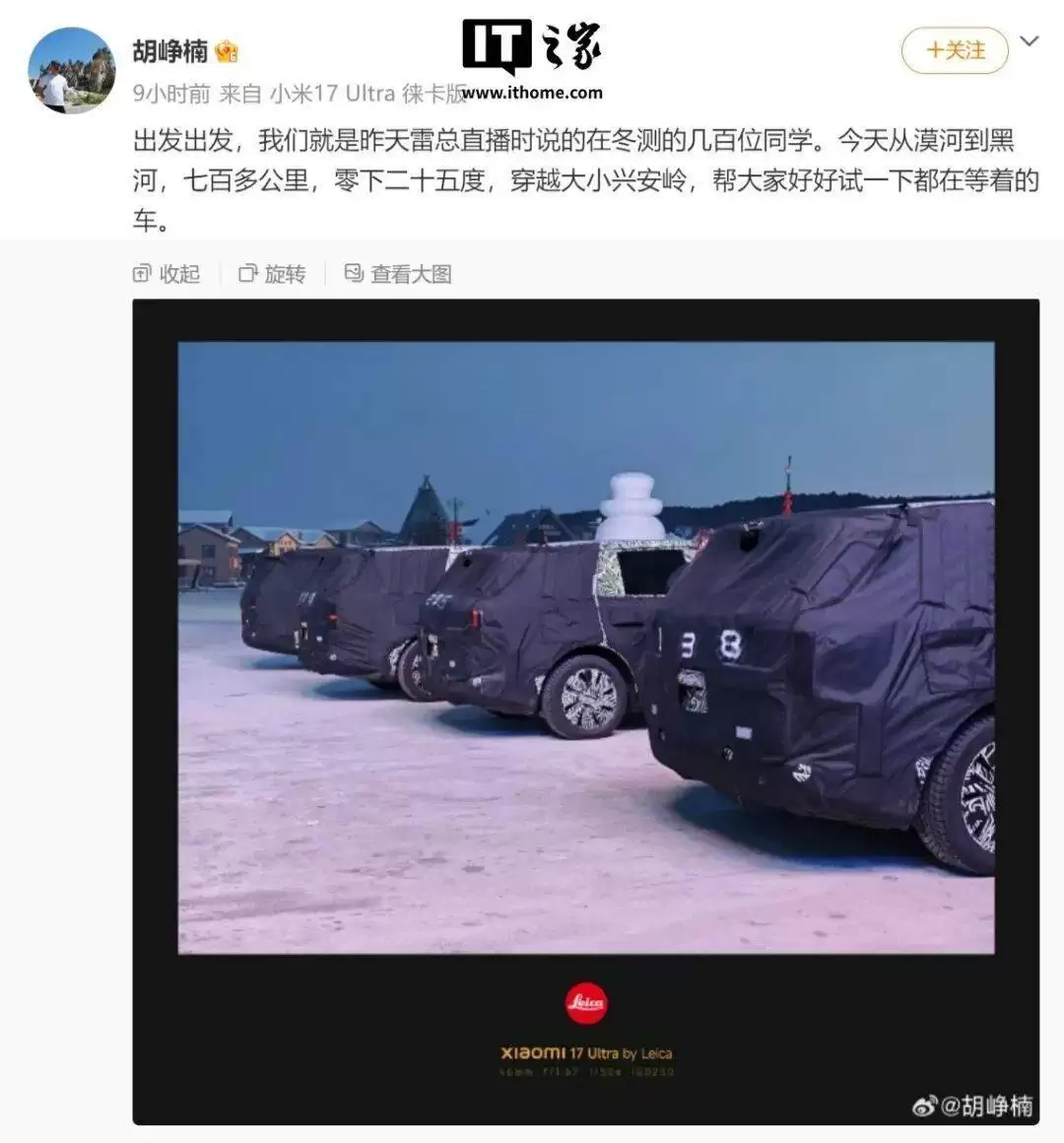 胡峥楠的发文透露,他正参与小米新车的冬季测试工作。在从漠河到黑河长达700公里的严寒行程中,车队需要在零下25度的极端环境下,穿越大小兴安岭。配图中,四台身披伪装的SUV测试车整齐列队,其车身轮廓与外界传闻的“YU9”外形高度吻合。结合其小米汽车高级顾问的身份,以及文中提及的“雷总直播时说的冬测”等信息,外界普遍认为,这很可能就是小米即将推出的首款大型增程SUV。