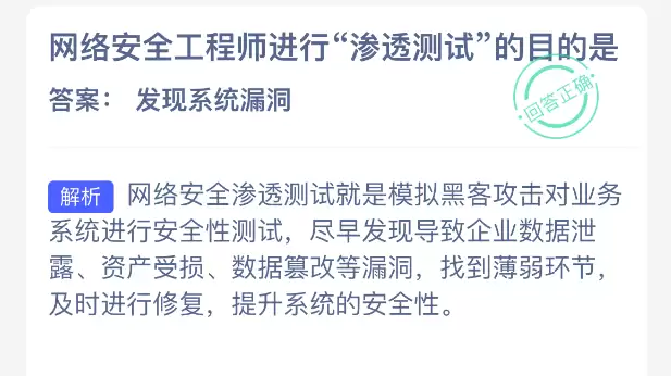 网络安全工程师开展“渗透测试”究竟是为了什么?蚂蚁新村每日答题活动2026年2月2日题目已公布!坚持参与答题,积累木兰币,就能助力小镇建设加速。回答正确本题,即可立即享受“产速+3/时”的加速奖励!今天的正确答案是【发现系统漏洞】。