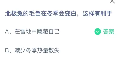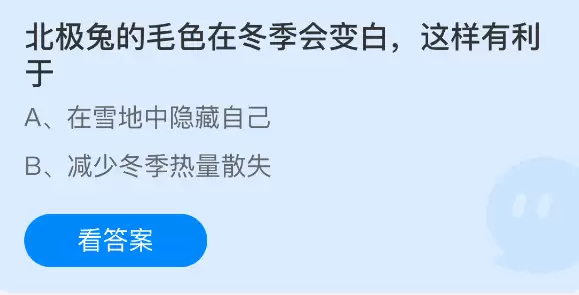 北极兔的毛色到了冬季会神奇地转为纯白,这种变化有什么好处呢?支付宝小鸡课堂已经开课啦!每天花一分钟答题就能赚取饲料,喂养小鸡的同时也是在奉献爱心!既轻松又充满意义!2026年2月3日蚂蚁庄园的小课堂题目正确答案是【在雪地中隐藏自己】,北极兔在冬季毛色变白,正是为了能在雪地中更好地隐藏自己。