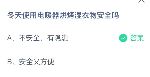 冬天用电暖器烘烤湿衣物安全吗?支付宝小鸡课堂开课啦!每天花一分钟答题赚饲料,喂喂小鸡就能献爱心!轻松又有意义!2026年2月2日蚂蚁庄园的题目正确答案是【不安全,有隐患】,冬天使用电暖器烘烤湿衣物非常不安全,存在严重的火灾隐患。