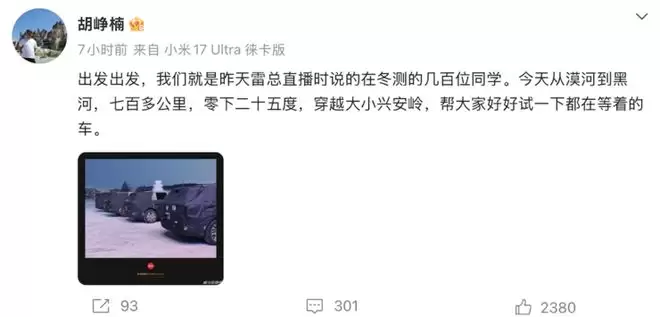 雷军2月1日晚间在小米汽车试验室直播中透露,小米汽车在吐鲁番(高温)、黑河(高寒)、昆仑山(高原)、海南(高温/高湿)4大极端环境开展测试,当前,小米汽车测试相关团队人数已经超过800人。而胡峥楠所在的就是雷军提及的数百人的冬测团队。(车东西)