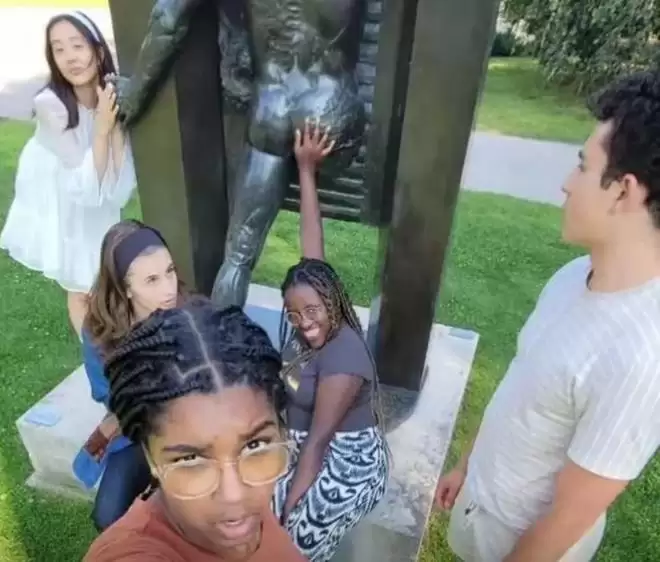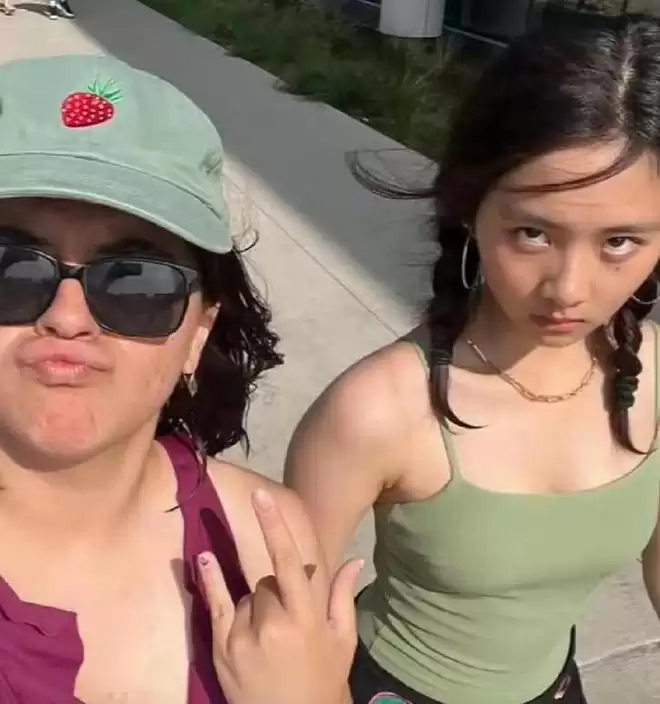 和同学们一起合影,也会刻意与男同学保持距离。她穿着黑色露脐T恤、黑色高腰裤,身体明显偏离一旁的男同学。青春期女孩子该有的矜持,在她身上一点也不少。