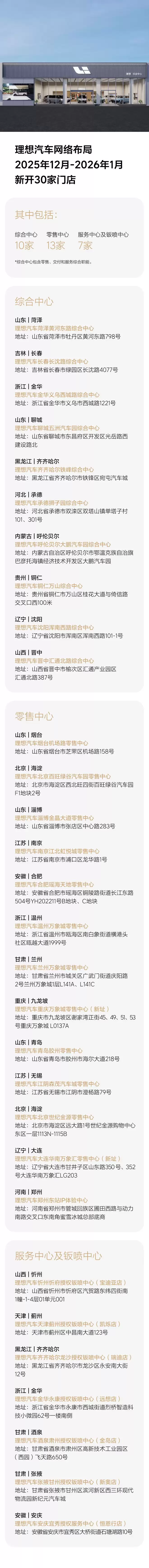 理想汽车最新发布的数据显示,公司正积极拓展服务网络。从2025年12月到2026年1月,短短两个月内,理想汽车在全国范围新开设了30家门店。这些新店包括10家综合中心、13家零售中心、7家服务中心以及钣喷中心,旨在全方位优化用户从购车、用车到售后服务的全流程体验。