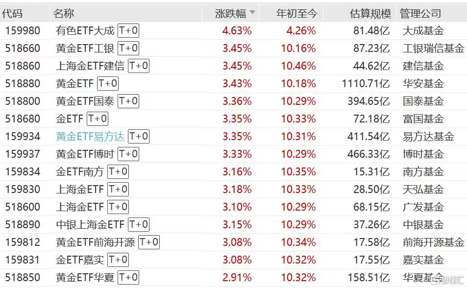 ETF方面,黄金ETF、上海金ETF及金ETF涨幅均超过3%,年内累计涨幅已超10%。