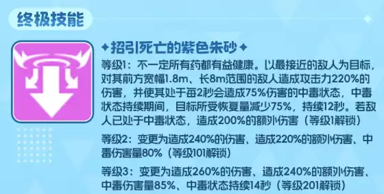 瑞贝卡的终极大招,是可以“招引死亡的紫色朱砂”技能。使用此技能时,瑞贝卡会以最近距离的敌人为目标,在前方长38米、宽1.8米的扇形范围内,对所有敌人造成攻击。此刻,她先造成200%的伤害,随后会附加一层更强力的中毒效果,使每2秒带来的基础伤害达到75%,比之前的50%又高出一截。在中毒状态生效期间,所有目标受到来自对方向友回复时,其回复量也会减少75%。因此,当敌人已处于深度中毒状态时,我方带来的额外伤害以及减疗效果,都能迅速克制对方恢复角色的治疗能力。