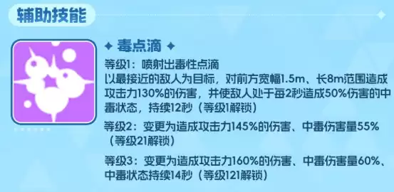 瑞贝卡的辅助技能名为“毒点滴”,其带来的中毒效果亦非常显著。使用时,瑞贝卡能喷射出各种剧毒液滴,攻击附近目标。对敌人进行输出时,可造成攻击力130%的伤害。受此类攻击影响,敌人将持续处于中毒状态,同样是每2秒造成50%的伤害。后续10秒内,该伤害总计可触发6次。她的第二个辅助技能“合成肾上腺素”,能在游戏中快速刺激队友,效果持续10秒。在此期间,可为当前攻击力最强的队友带来生命与攻击数值提升20%的增益。不仅攻击力提升20%,暴击率也将随之提高10%。因此,对于当前依赖攻速的游侠类角色而言,瑞贝卡带来的这类增益无疑是极为强大的助力。