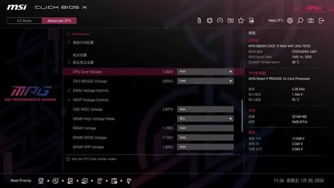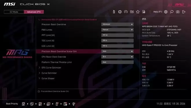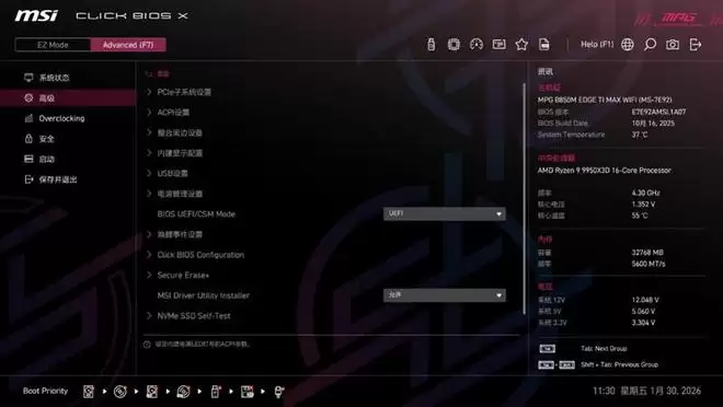 微星MPG B850M EDGE TI MAX WIFI刀锋 钛在性能方面与更高端的X870E主板相比,没有任何差距。比如搭配锐龙9 9950X3D时,单核性能比MEG X870E ACE MAX战神还高了0.3%,多核仅有0.5%的差距,基本上是测试误差,另外二者的BIOS界面与功能也基本相同。