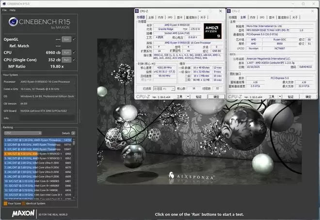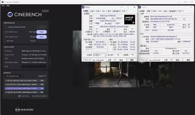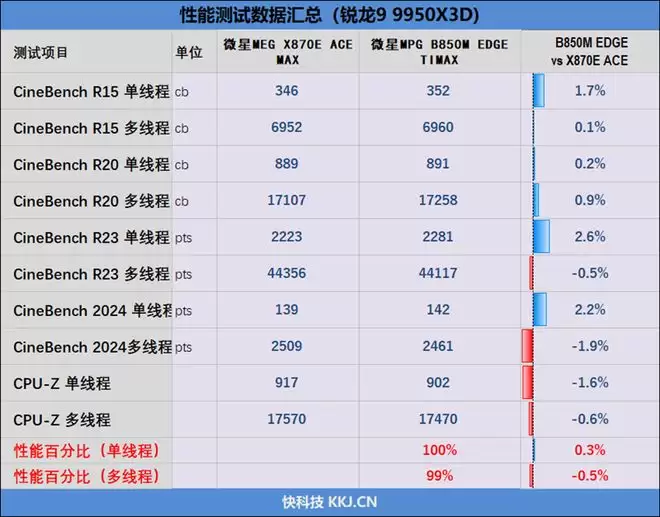 在搭配锐龙9 9950X3D时,微星MPG B850M EDGE TI MAX WIFI刀锋 钛的单核性能比MEG X870E ACE MAX战神还高了0.3,多核性能仅有0.5%的差距,总体来说,2者的性能在一个档次