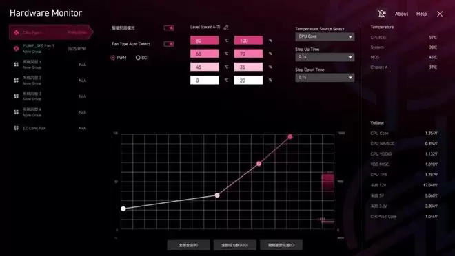 主板集成了1个4pin CPU风扇、1个水冷头4Pin接口、4个4pin机箱风扇接口。6个风扇都可以单独依据CPU、MOS、主板或者机箱内部温度来设置温度曲线