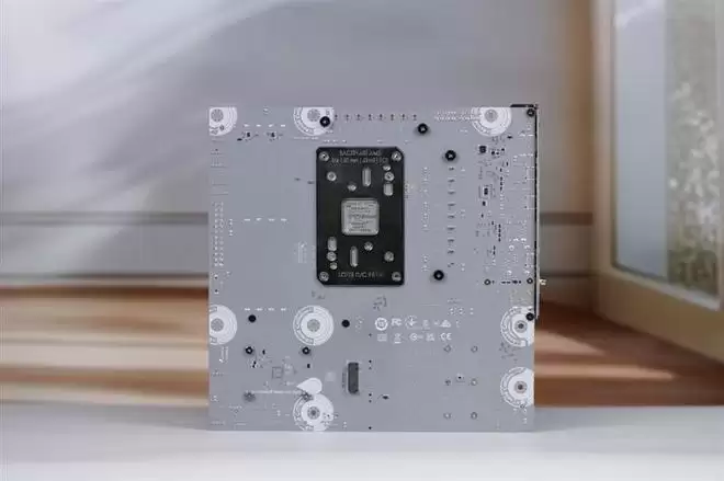 主板背部是银灰色,左下角有一个PCIe 4.0 x4 SSD。